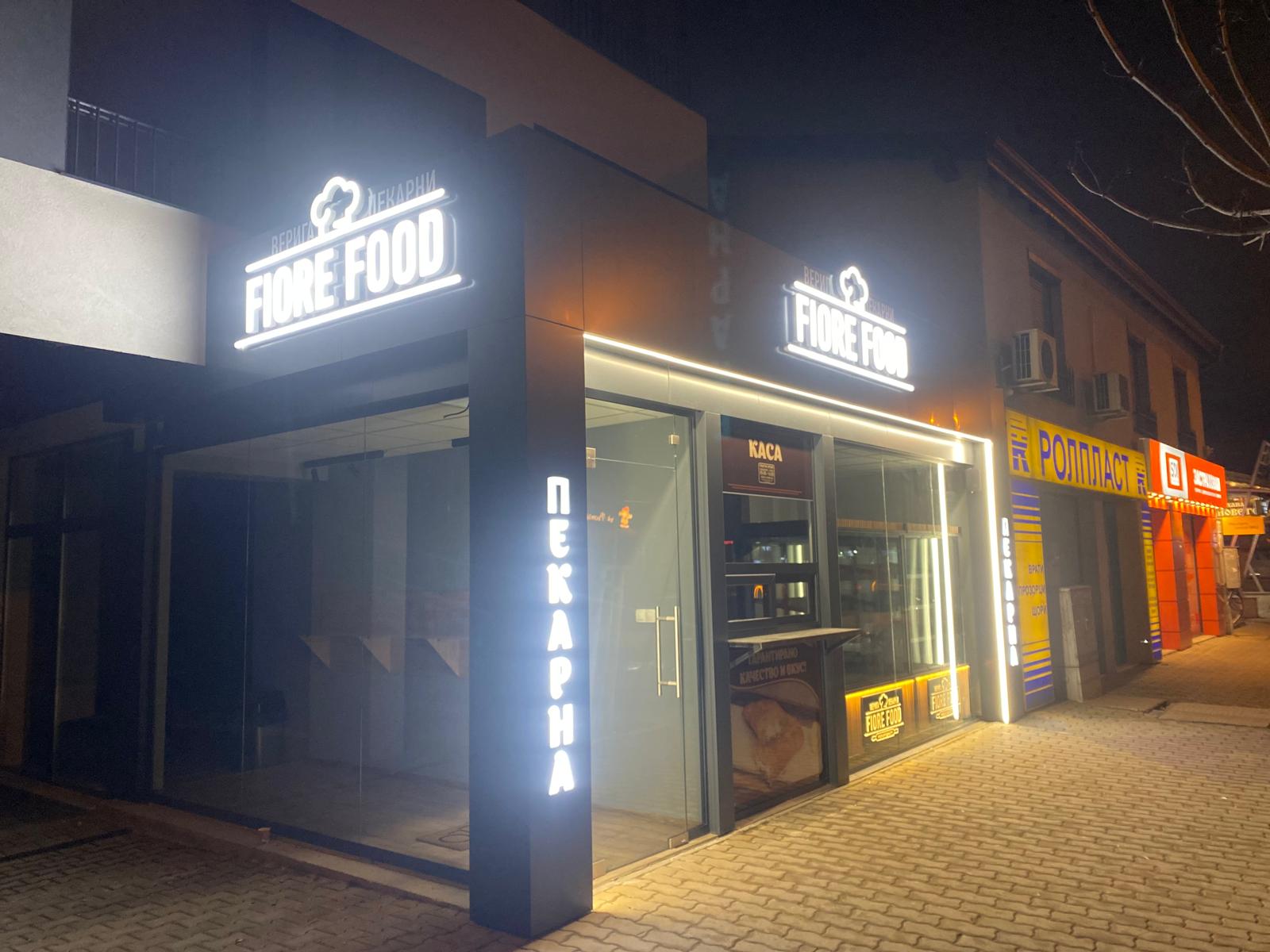 Цялостна екстериорна трансформация на магазин Fiore Food - фасадна облицовка, табели и обемни букви.